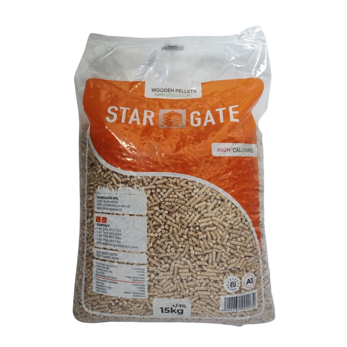 Fiecare sac contine 15 kg de peleti de inalta calitate, ambalare ce asigura usurinta in manipulare si stocare. Peletii sunt comprimati cu atentie pentru a avea o densitate optima, ceea ce ii face ideali pentru sistemele de transport automatizat. Cu Star Gate, nu numai ca incalzirea ta devine mai eficienta si mai prietenoasa cu mediul, dar te bucuri si de un produs de calitate superioara, creat pentru a satisface nevoile tale termice intr-un mod sustenabil.